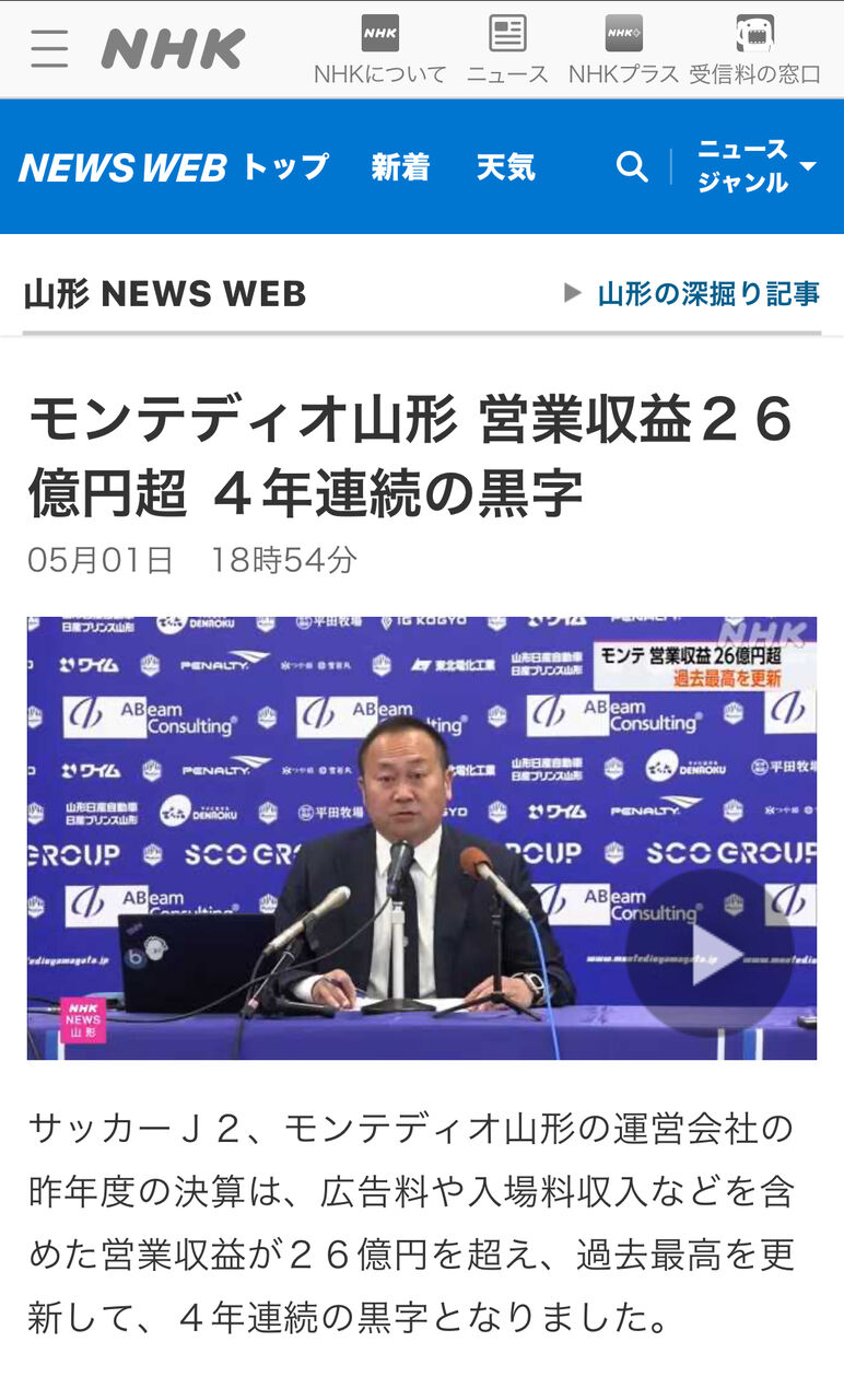 サッカーJ2・モンテディオ山形の決算報告が1日行われ、売上高にあたる営業収益が26億円を超え、4年連続で過去最高を更新したことがわかりました。