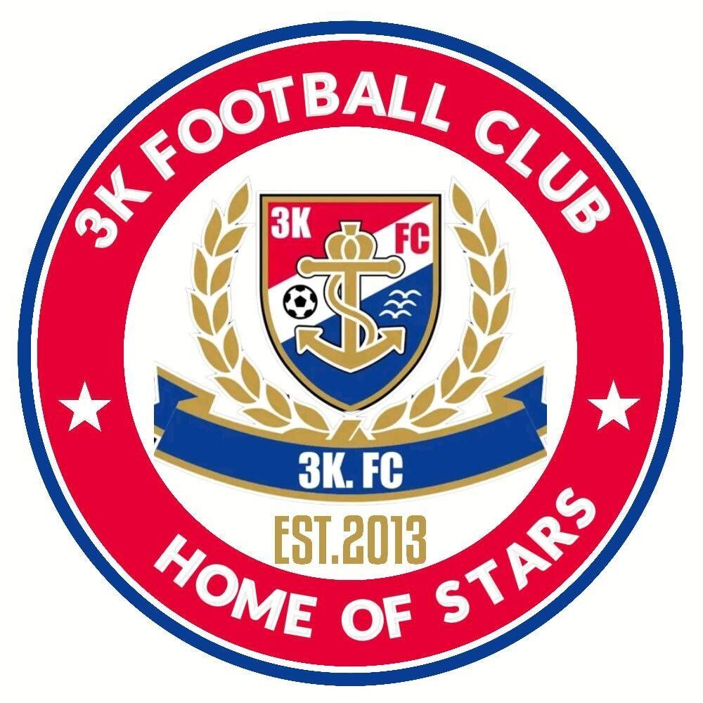 外周の太い赤いリング部分には、上部にクラブ名である「3K FOOTBALL CLUB」、下部にチームのスローガンと思われる「HOME OF STARS」という白い大文字がアーチ状に配置され、左右の余白には白い星が一つずつあしらわれている。